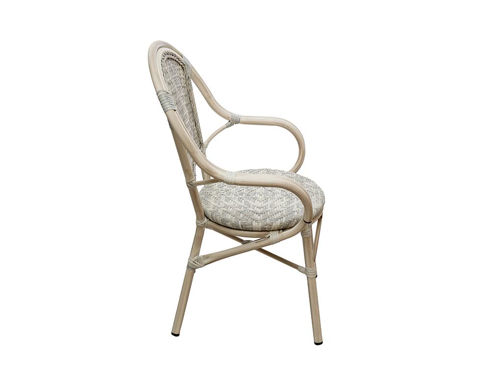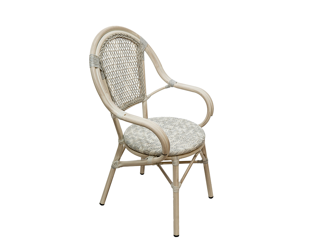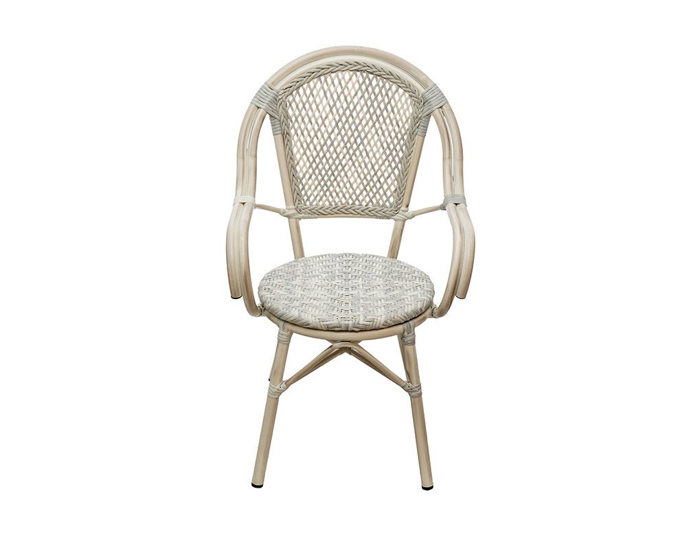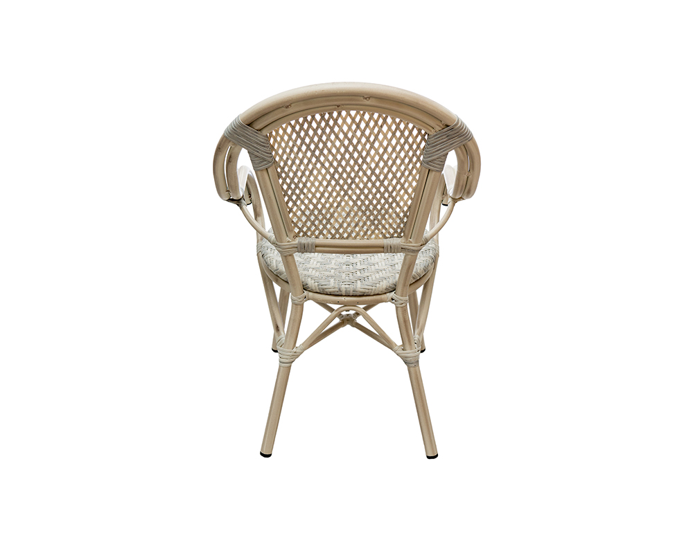 Finish: Aluminum powder coated frame with synthetic rattan and grey finish. Material: Alu with synthetic Rattan. Dimension: L57 x W57 x H83 cm COLOR: WHITE – L.GREY / Bamboo Finish
