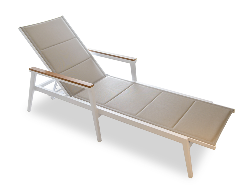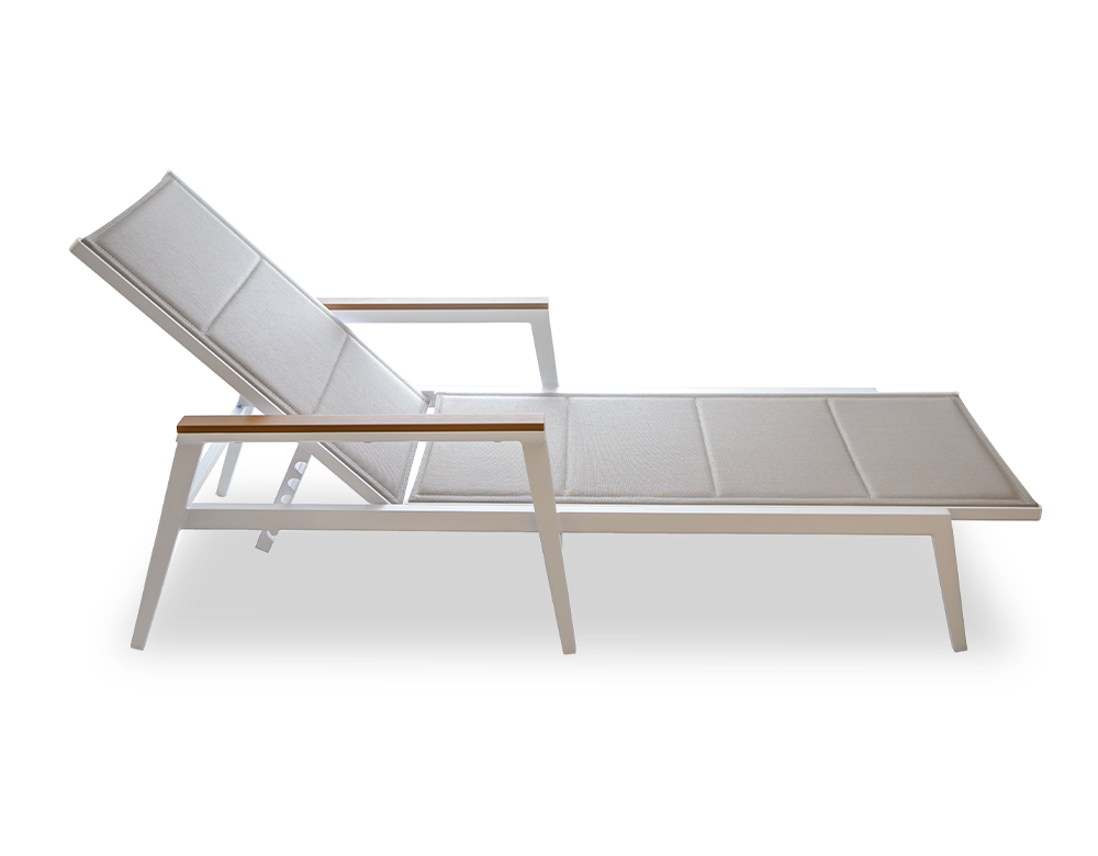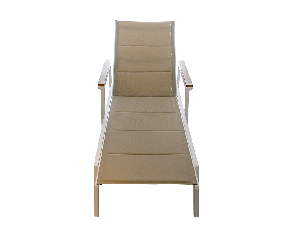 FINISH: White frame, aluminum with powder coated double-layer Textilene grey fabric with fast dry Foam inside with teak Polywood slat on top of the armrest. DIMENSION: L 198 X W 70 X H 46 cm
