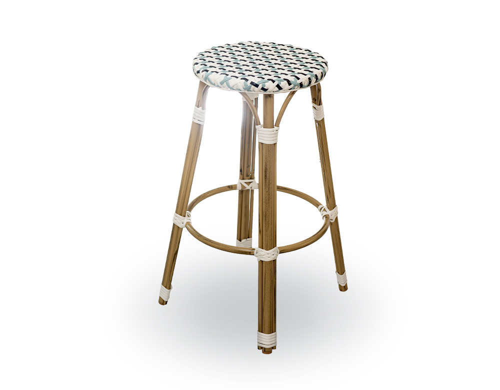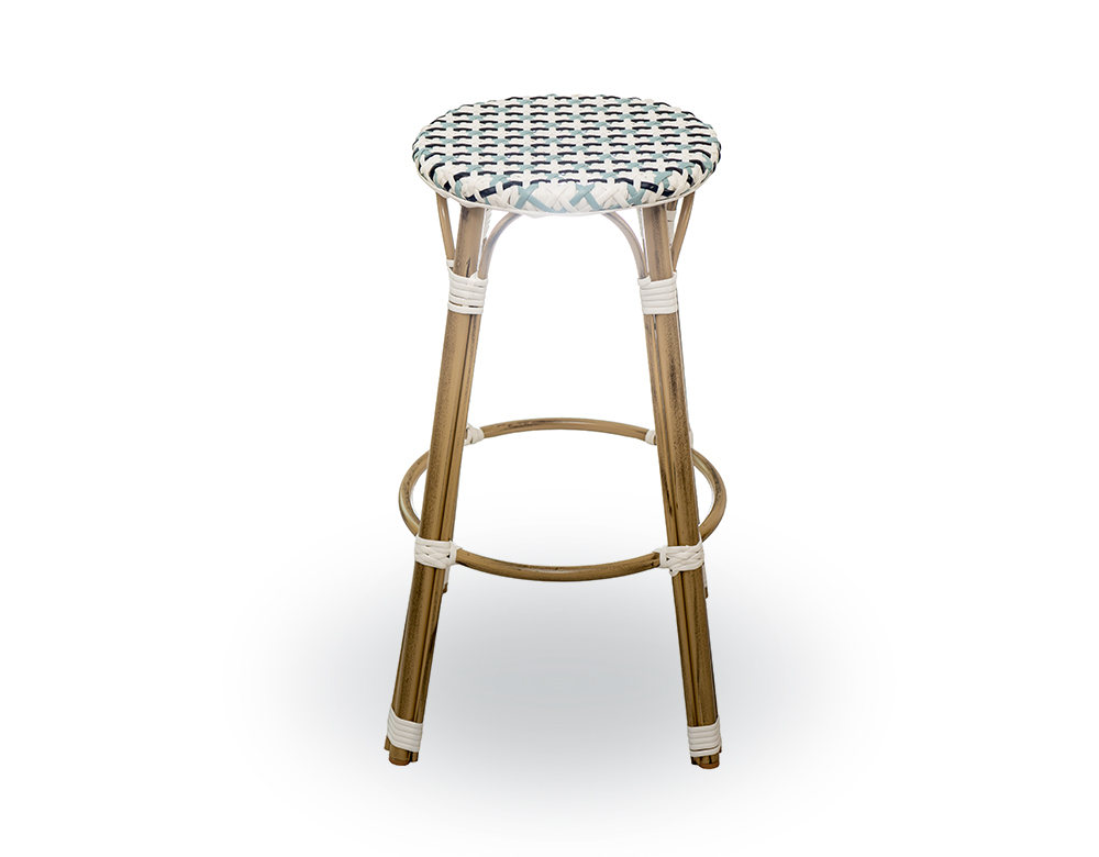 MATERIAL: SYNTHETIC RATTAN Seat with Aluminium Frame & Legs 28*1.5mm COLOR: WHITE – BLUE /Bamboo Finish DIMENSIONS: DIA 35 cm X H 75 CM